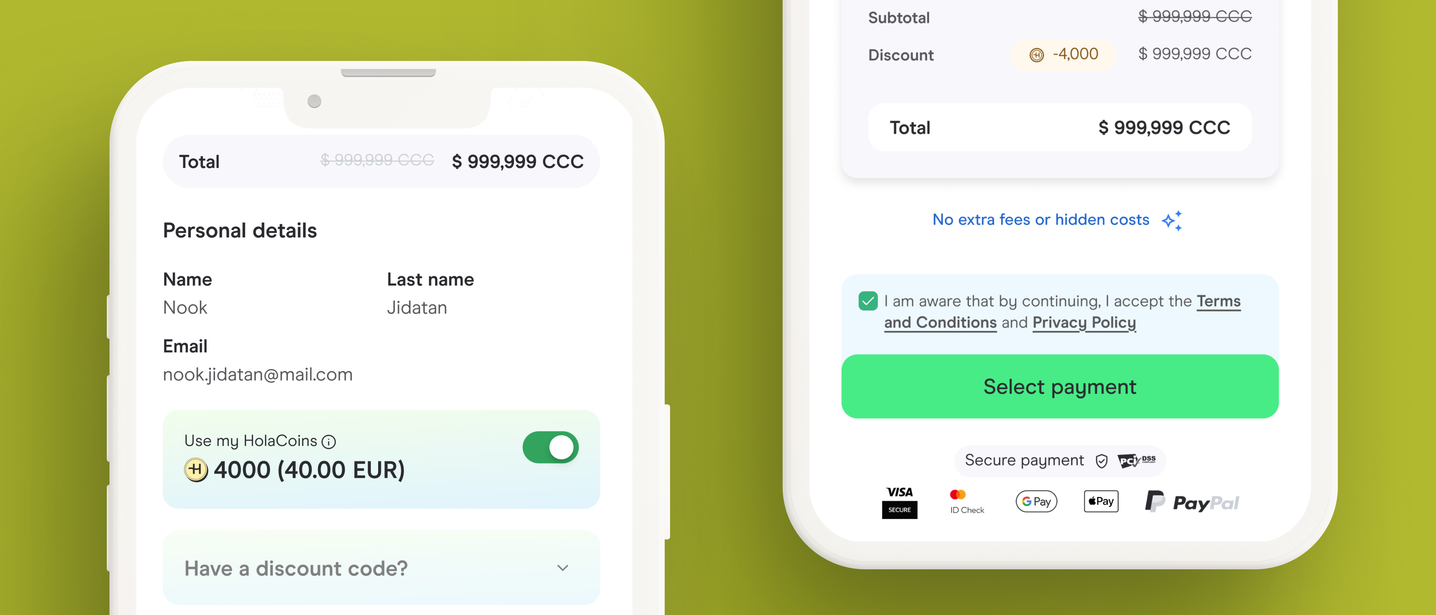 End-to-end UX and UI design of the Holacoins payment module